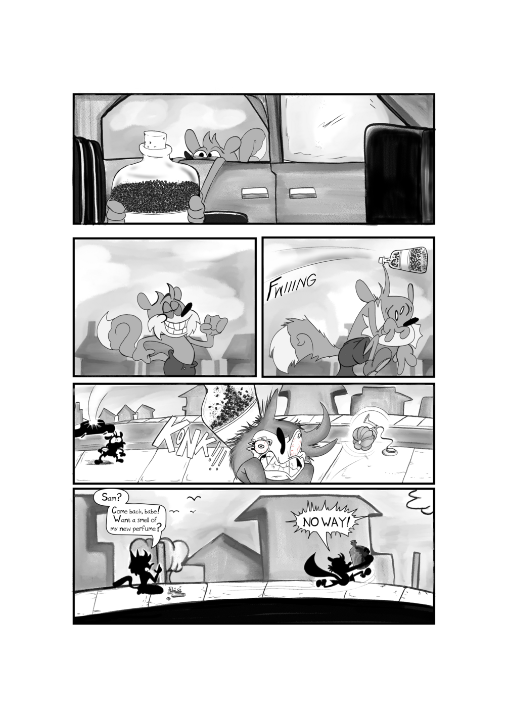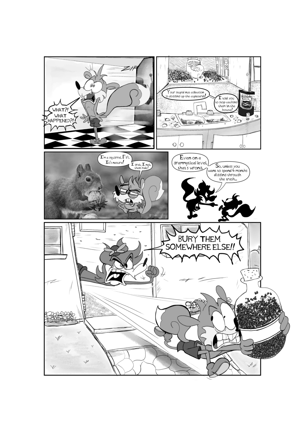 Roommates Sam Squirrel and Fifi Fox have a bit of a problem... Sam's nut collection's clogging up their house. If their house doesn't want to become Sam's winter storage, the silly squirrel's gonna have to store his nuts in a more secure location. Being the man with the golden jar, Sam takes it upon himself to store his nuts in the safest place he can find... even if he's gotta take an entire comic to do it!