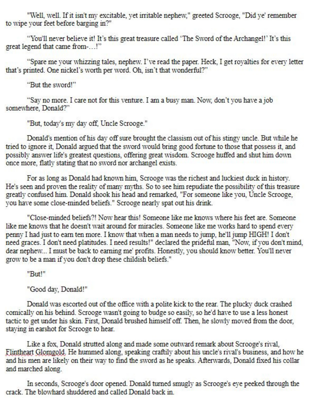 Recent news has reported a mystical sword hidden in the deepest part of Jerusalem. The sword is said to be as old as the Old Testament itself! Many are in awe at the wonders the sword could bring... everyone except that ol' miser, Scrooge McDuck, that is. Thankfully, his way wayward nephew, Donald Duck, is eager to push Scrooge to glory with the promise of riches far beyond his wildest dreams! That, and finding the sword will give Scrooge a wealthy advantage over his rivals. It's the story to GO QUACKERS over in...